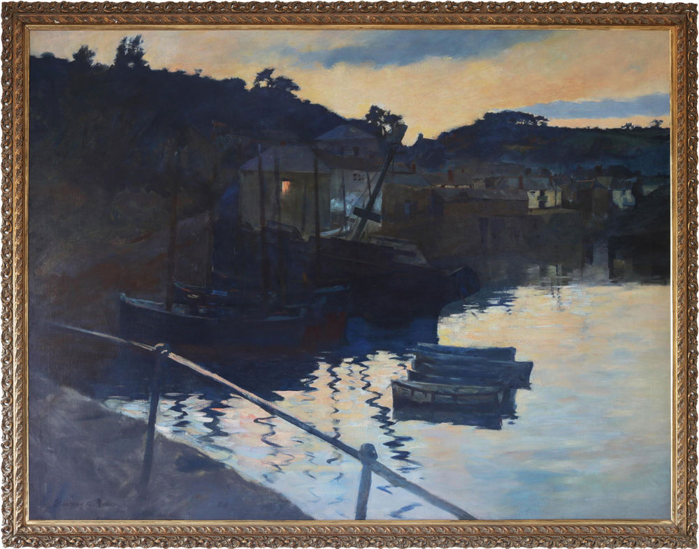 This full-size study would have been largely painted en plein-air. Forbes was renowned for working up these large canvases in situ. The brushwork is therefore bold and swift as the artist has quickly captured the last of the day’s light in the sky above Newlyn, its reflection in the water and the lamp light radiating from a house window. Fires are being lit as we see smoke drift across the harbour. The landscape and buildings are more simply rendered against the artist’s preparatory ground.